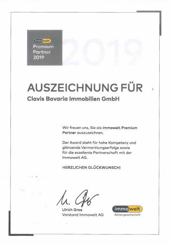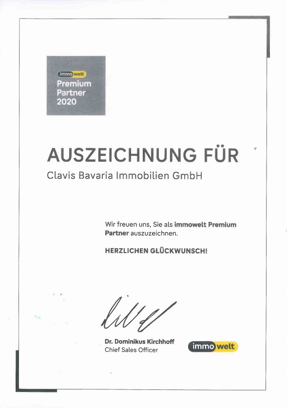 Aufgrund der hervorragenden Leistungen erhält Fa. Clavis Bavaria Immobilien GmbH für 2020 dies Auszeichnung "Premium Partner 2020" vom Immobilienportal Immowelt. Wir freuen uns über diese Anerkennung.