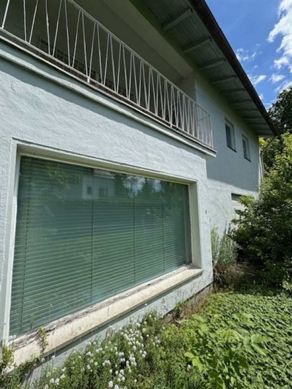 Altbestand zum Abriss: EFH-Villa aus den 50er-Jahren, sowie eine Garage, Pergola, Gartengeräteraum und Außenpool und ein stillgelegter Heizölerdtank in der Einfahrt