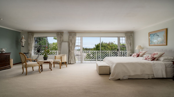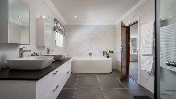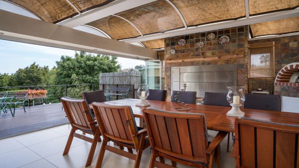 Das Haupthaus bietet: Eingang mit Gäste-WC, Lounge, Esszimmer, offene Gourmet-Küche, große Speisekammer und Abstellraum, Frühstücksraum, geschlossene Feuerstelle, Büro, überdachter Freisitz (mit Schiebetüren), Grillplatz (Braai), Pizza-Ofen, 3 geräumige Schlafzimmer (Hauptschlafzimmer groß mit Ankleide), 2 Bäder und Doppelgarage.